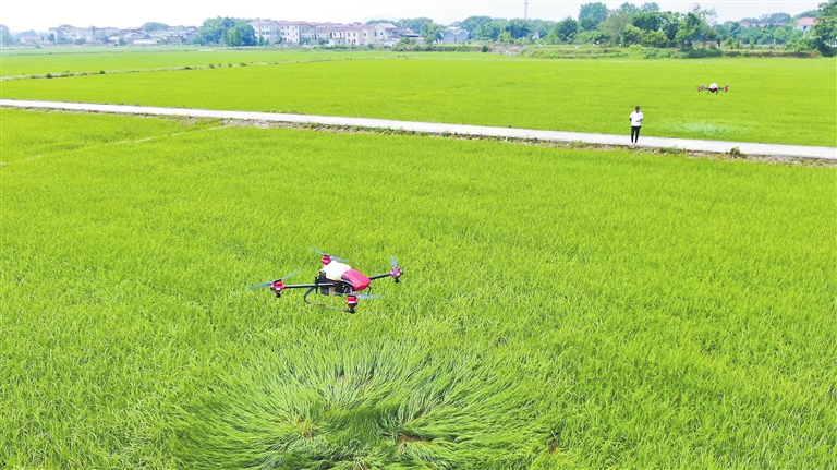 近日,江西省吉安市吉州区兴桥镇高标准农田建设区,飞防人员正操控着无人机给早稻喷洒农药。当地农民抢抓农时,积极开展农作物田间管理工作,田间地头一派忙碌景象。