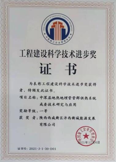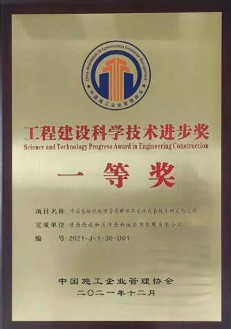 日前,由沣西集团能源公司联合陕西建工集团股份有限公司、西安交通大学等五家单位开展的“中深层地热地埋管管群供热系统成套技术研究与应用”项目荣获2021年工程建设科学技术进步奖一等奖。