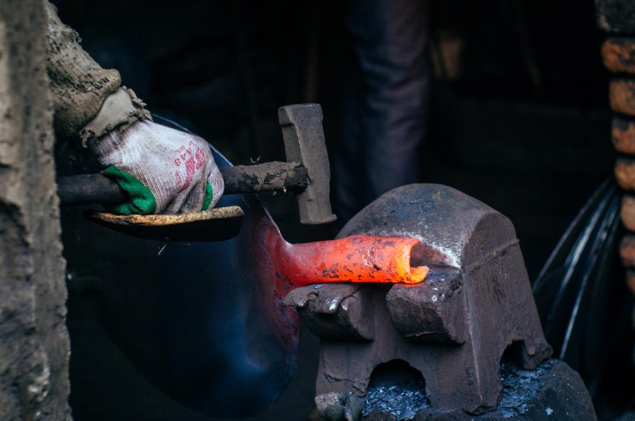▲ 历经十二道工序,十八遍火候,在一千度左右的高温锤炼,经受上万次锻打,方得一口好的章丘铁锅。(摄影 王雅洁)
