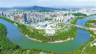 集格兰云天国际酒店暨购物中心、文化公园“四馆两中心”、桃江湿地公园、花园湾于一体的“信丰城市客厅”一角。