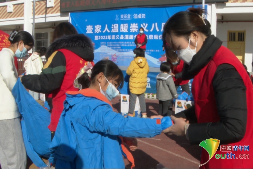 爱心志愿者帮孩子们穿上新棉衣。钟崇萌 摄
