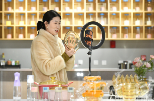 2月11日,河北省河间市一家工艺玻璃制品生产企业的工作人员在通过网络直播推介产品。新华社记者 牟宇 摄