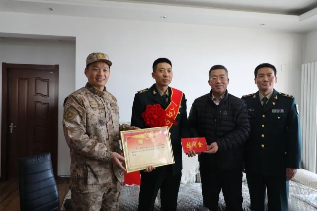 随后,部队代表、区人武部和区退役军人事务的同志将喜报和奖金送到满超的家中,并与军人家属亲切交谈,对他们毫无怨言支持满超在部队的工作表达感激之情,感谢他们为祖国培养了优秀人才,同时对满超取得的优异成绩表示祝贺。