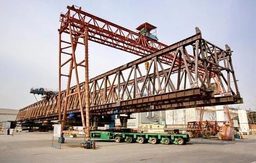 这是通联刚刚完工的2200吨节段拼装架桥机,满跨最大悬挂节段梁重量2200吨,最大跨度45米,能够适应高速铁路桥梁双幅架设、三幅架设等多种特殊工况。不久之后它将被运往印度,应用于孟买至艾哈迈德巴德高速铁路项目,同时“动身出发”的还有通联为此项目设计研发制作的250吨液压驱动运梁车。