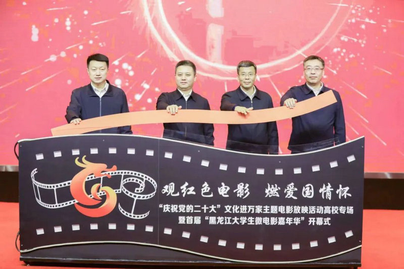 14日,由黑龙江省委宣传部、黑龙江省教育厅等单位主办,黑龙江电影制片厂、哈尔滨师范大学承办的“观红色电影 燃爱国情怀”“庆祝党的二十大”文化进万家主题电影放映活动高校专场暨首届“黑龙江大学生微电影嘉年华”开幕式在哈尔滨师范大学江北校区科学会堂举办。