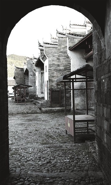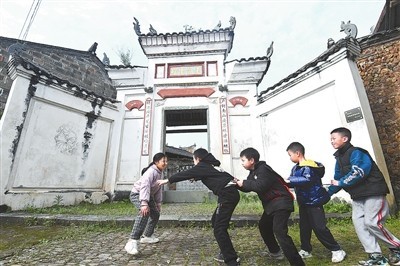 村里的孩子在楫松堂的八字大门楼前做游戏。