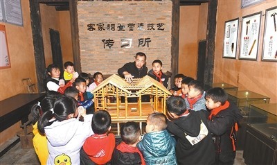 非遗项目客家祠堂营造技艺传承人罗金发(中)在向村里的孩子介绍祠堂建造知识。
