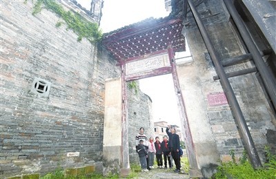 孩子们正在听村干部讲解密溪村尚义坊的故事。