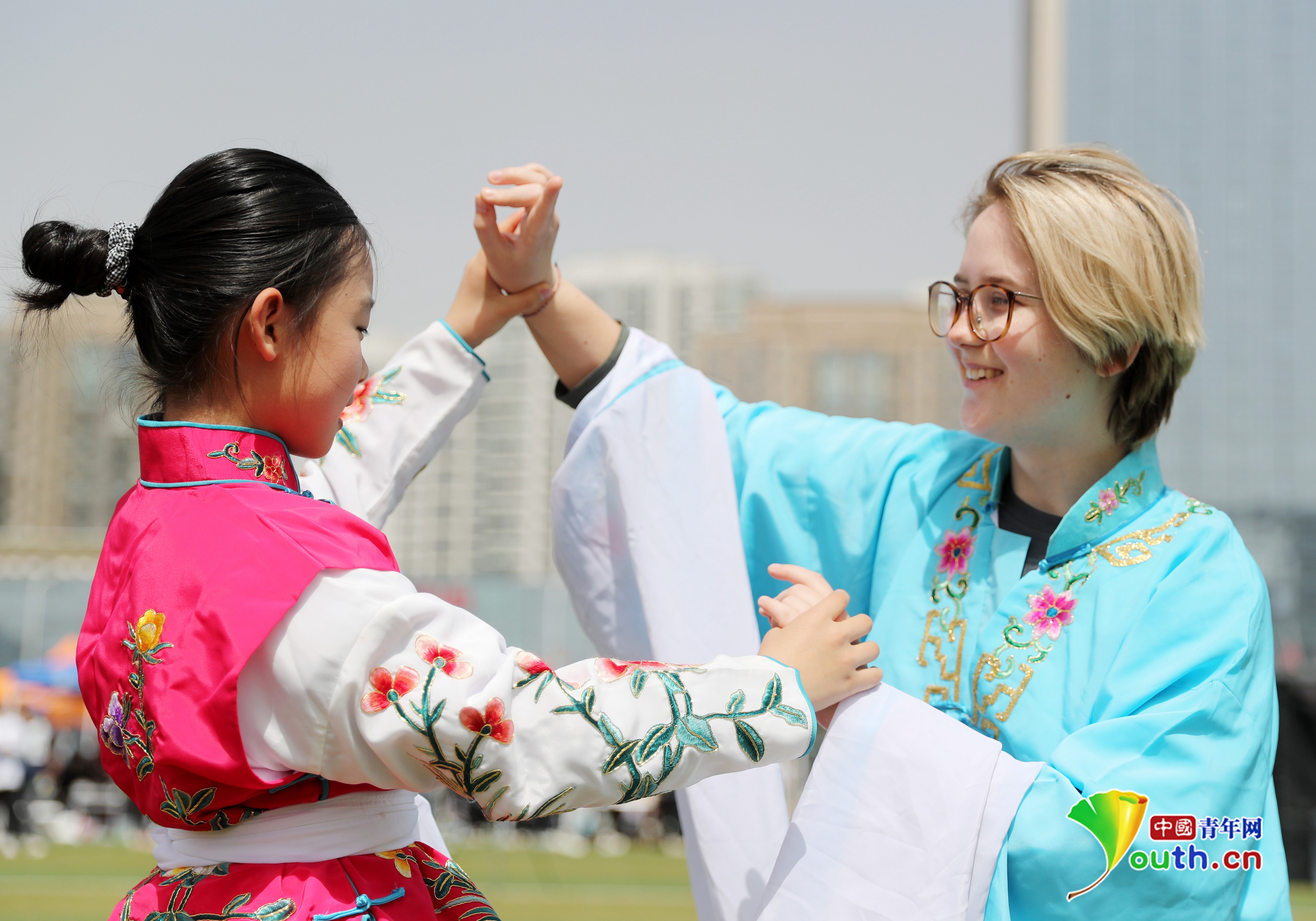 4月15日,青岛西海岸新区珠江路小学的学生在指导中国石油大学(华东)外国留学生京剧的表演技巧。张进刚 摄