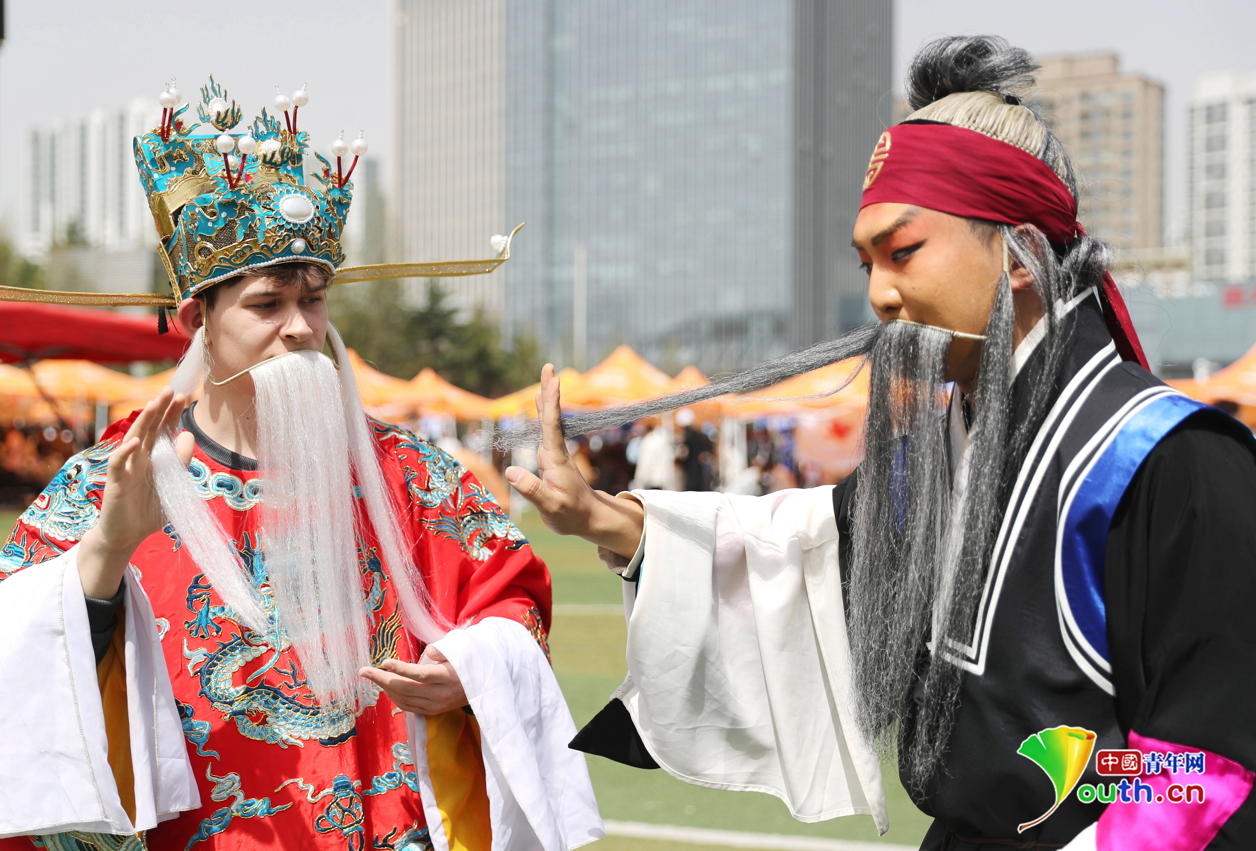 4月15日,中国石油大学(华东)韵远京剧队的队员(右)在指导外国留学生京剧的表演技巧。张进刚 摄