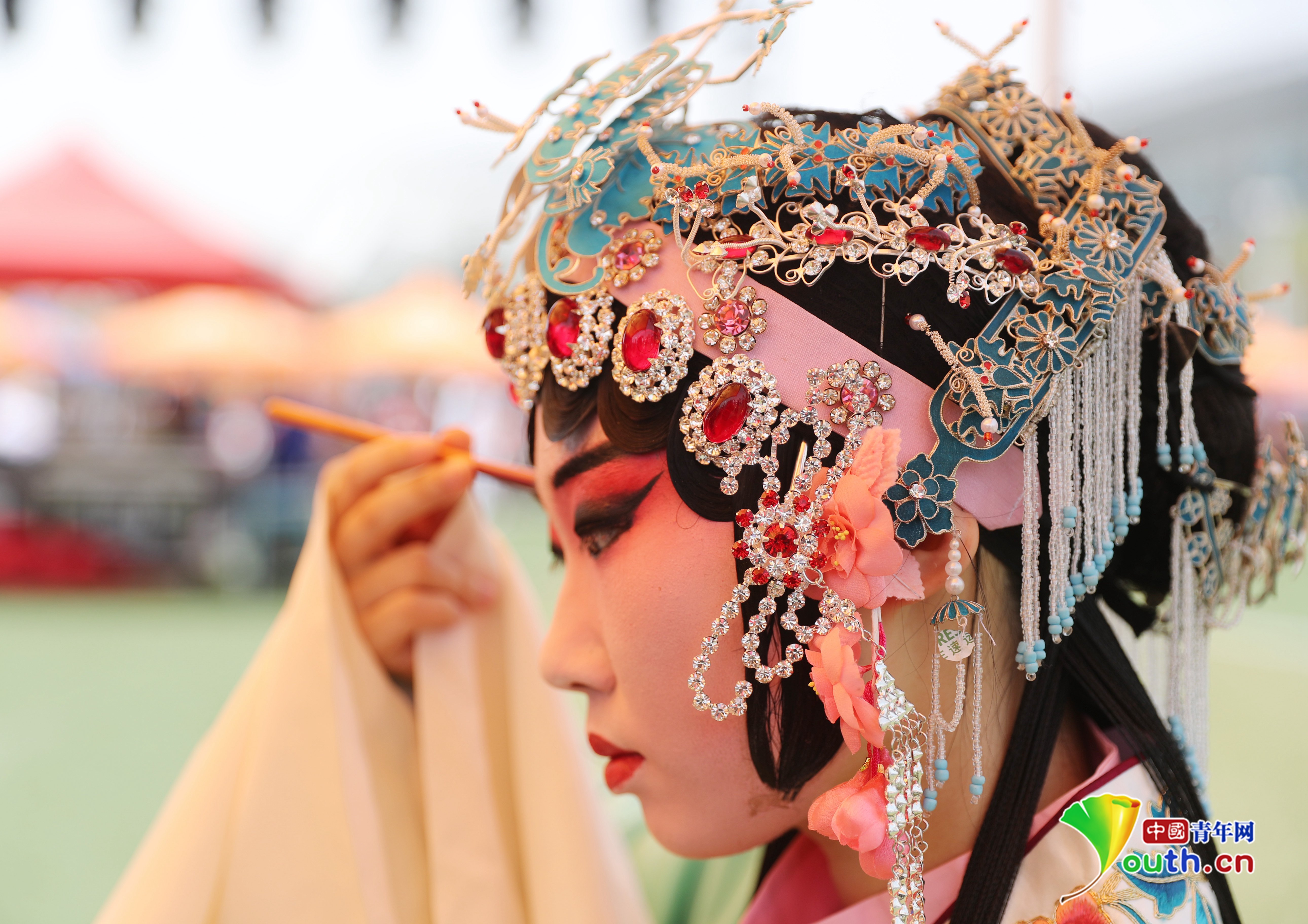 4月15日,中国石油大学(华东)韵远京剧队的队员在化妆。张进刚 摄