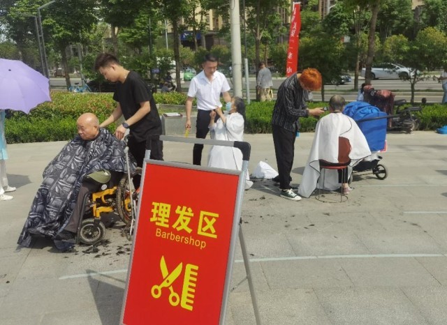同时,“养老集市”为大家送来了安全救护知识教学、心理疏导、磨刀等服务,为老年居民带来了实惠和便捷;理发摊位的师傅免费为老人剪发,他开始之前都会认真询问每一位老人对发型的要求,并耐心细致地进行修剪,得到了老人们的称赞。