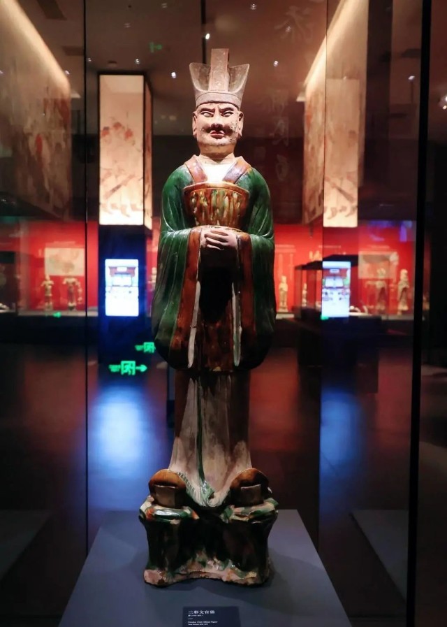 除了精妙绝伦的建筑,博物馆第二展厅“万邦来朝”的画卷更让人震撼于大唐的宏伟兴盛,左右相对的“跪俑”与“拜俑”栩栩如生,还有衣着华丽、高眉深目的胡官,身着男装的女官,不同人物的形象穿搭各有不同。笏头履、乌皮靴……文武百官形态迥异,在无声中展现着盛唐宫廷朝事的庄重。