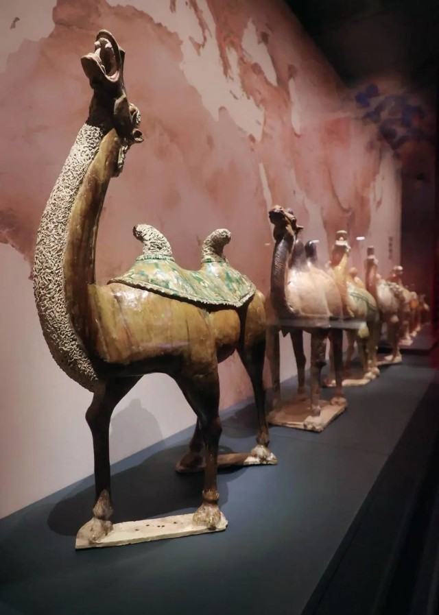 在众多色彩明艳、形态鲜活的唐三彩俑中,展现唐时丝绸之路的文物格外引人注目,骆驼、骏马、西域胡人……它们组成丝绸之路的历史记忆,将大唐时对外交流的繁荣景象一一保存。