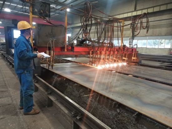 走进杭萧钢构车间,只见焊花四溅,机器打磨声、焊缝气刨声、钢构件敲击声互相交错,到处一片热火朝天的景象。下料、组立、埋弧焊、铆焊、抛丸打磨、涂装……各个生产环节的工人们熟练操作,钢板经过切削和焊接,被加工成造型各异的钢构件,将运用在不同的建筑部位。