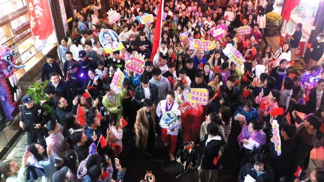 “程灵芝,我爱你!”当晚,文昌里景区好不热闹,上千名市民到场“追星”,程灵芝一出场,现场便爆发出了雷鸣般的掌声,大家纷纷送上鲜花,夹道欢迎冠军凯旋。