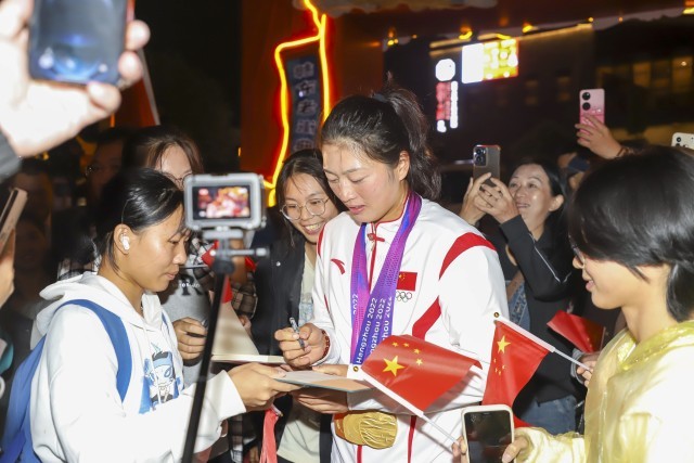 舞狮表演、锣鼓欢迎……在热闹的欢迎仪式后,程灵芝登上古戏台,向现场观众推介抚州并分享自己此刻的心情,她说:“回到家乡,我的心情非常激动,正是因为有抚州市委、市政府及父老乡亲的鼓励和支持,我才能拿到这3枚宝贵的亚运会金牌。文化抚州、梦想之舟,抚州是我成长的地方,希望抚州人民努力为自己所爱的城市添砖加瓦,将大美抚州推荐给全国及全世界人民。欢迎全国游客、世界人民来抚州吃资溪面包、品临川牛杂,共同感受抚州厚重的文化底蕴。”