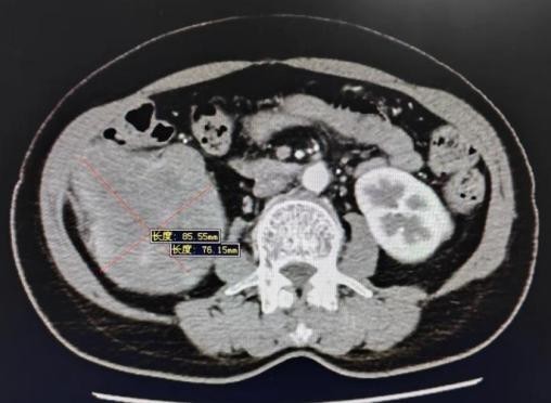 增强CT提示右肾肿瘤截面及与结肠关系密切