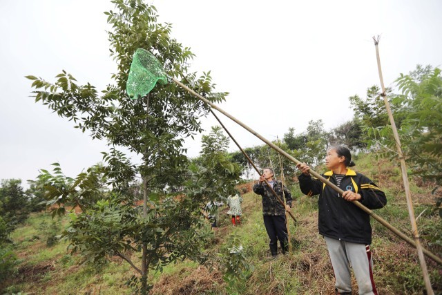 近年来,抚州市东乡区充分利用山地资源,发展林果产业,推广种植油茶、杨梅、核桃等经济作物,带动村民增收致富,让绿水青山成为农户增收的金山银山。图为东乡区甘坑生态林场东硕薄壳山核桃迎来丰收,村民正在采摘核桃。通讯员 饶方其 摄