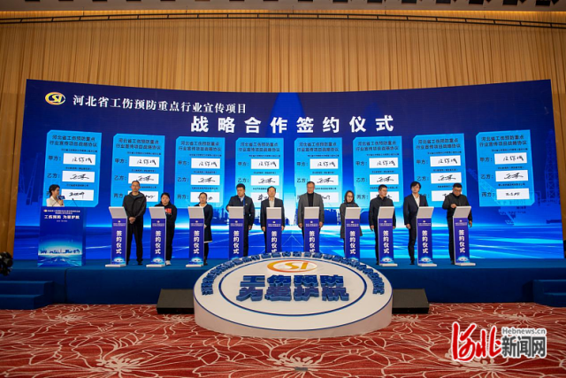 图为河北省工伤预防工作领导小组办公室、河北新闻网(燕赵都市报)与河北省工伤预防重点行业企业签署战略合作协议。