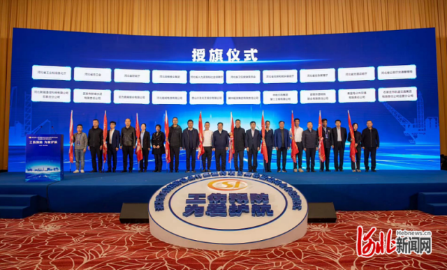 图为河北省工伤预防工作领导小组各成员单位、河北日报报业集团相关负责人为河北省重点行业的10位工伤预防宣传员代表授旗。