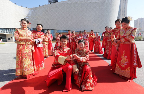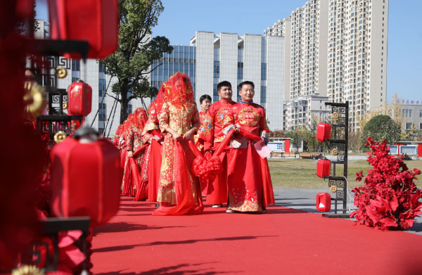 2023年11月22日,江西省抚州市东乡区2023年首届集体婚礼仪式在该区新时代文明实践中心广场举办。10对新人穿戴传统服饰,通过跨鞍马、拜天地、结发礼、合卺礼等仪式,举行了简约温馨的传统中式集体婚礼。