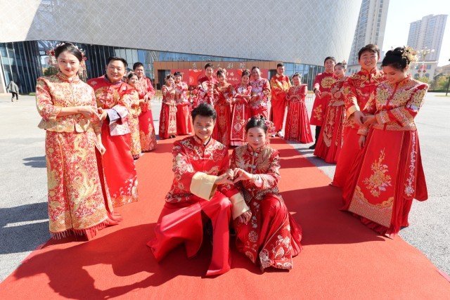 11月22日,抚州市东乡区“不要彩礼要幸福”2023年(首届)集体婚礼仪式在该区新时代文明实践中心广场举行,10对新人穿戴传统服饰,通过跨鞍马、拜天地、结发礼、合卺礼等仪式,践行和倡导婚事新办、喜事简办、移风易俗新观念,营造节俭办婚、勤俭持家的文明新风尚。