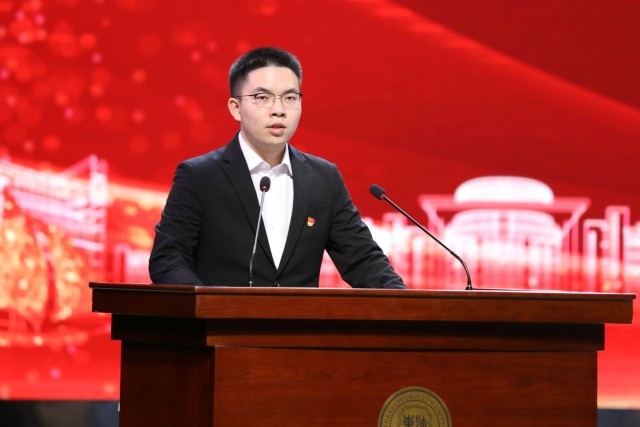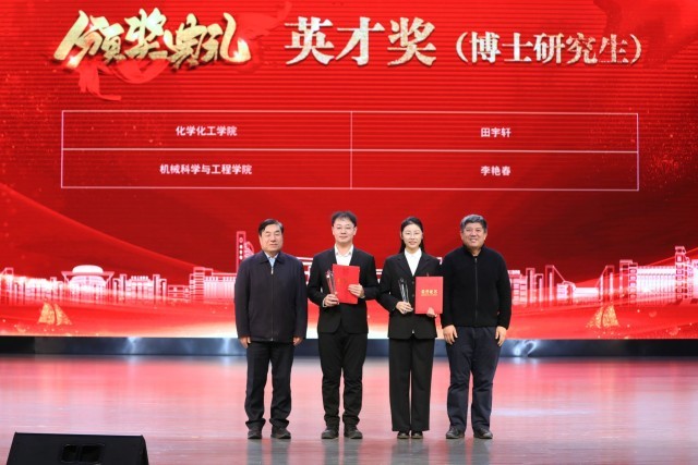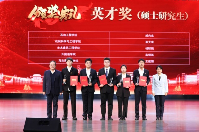 获奖学生代表、机械科学与工程学院严天佑发言。他向王玉普院士、各位捐赠人、学校、老师表达感谢,表示要心怀感恩、不负期待、勤学知识、苦练本领,传承弘扬大庆精神铁人精神,接过老一辈石油人手中的旗帜,助力国家能源事业发展,让青春在中国式现代化火热实践中绽放绚丽之花。
