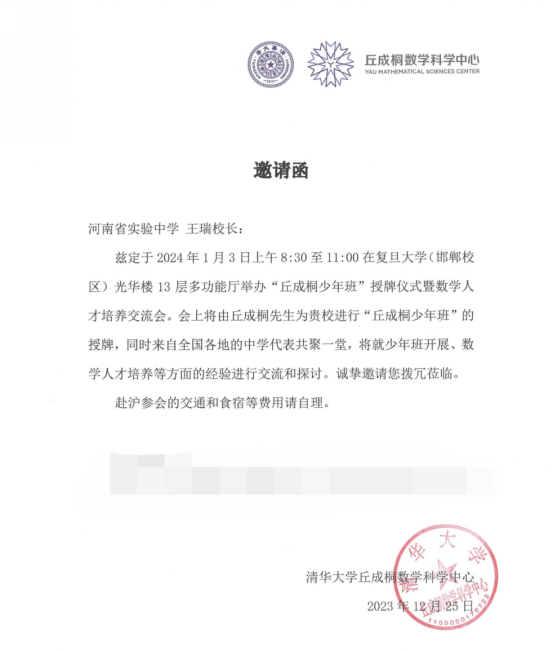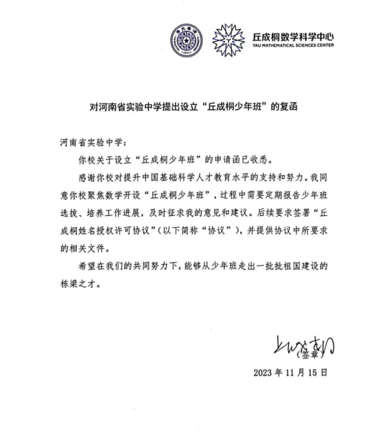 丘成桐先生复函,授权我校设立丘成桐少年班