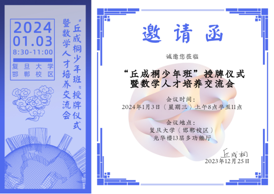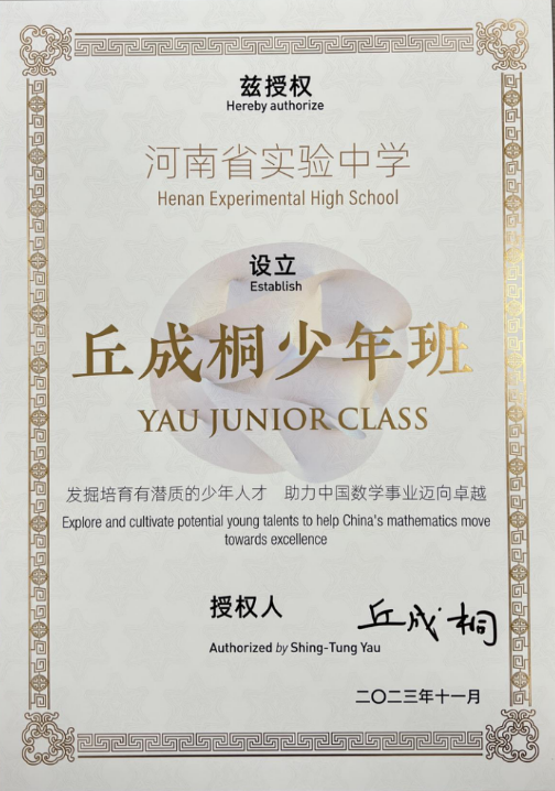 1月3日,从上海传来好消息,在复旦大学(邯郸校区)光华楼多功能厅,河南省实验中学校长王瑞从享誉世界的著名数学家、清华大学丘成桐数学科学中心主任、中国科学院外籍院士丘成桐先生手中郑重接过“丘成桐少年班”牌匾,标志着“丘成桐少年班”正式落户河南,河南首次拥有了“丘成桐少年班”。