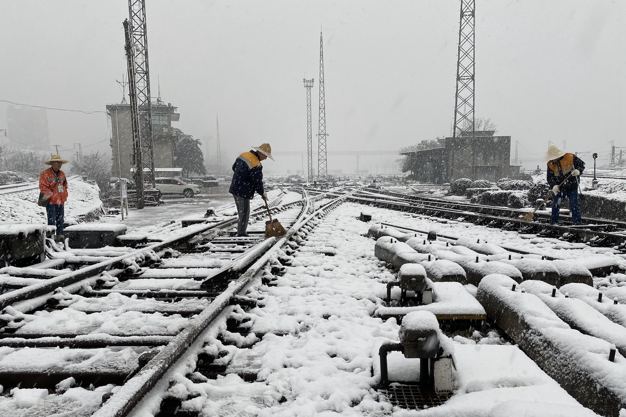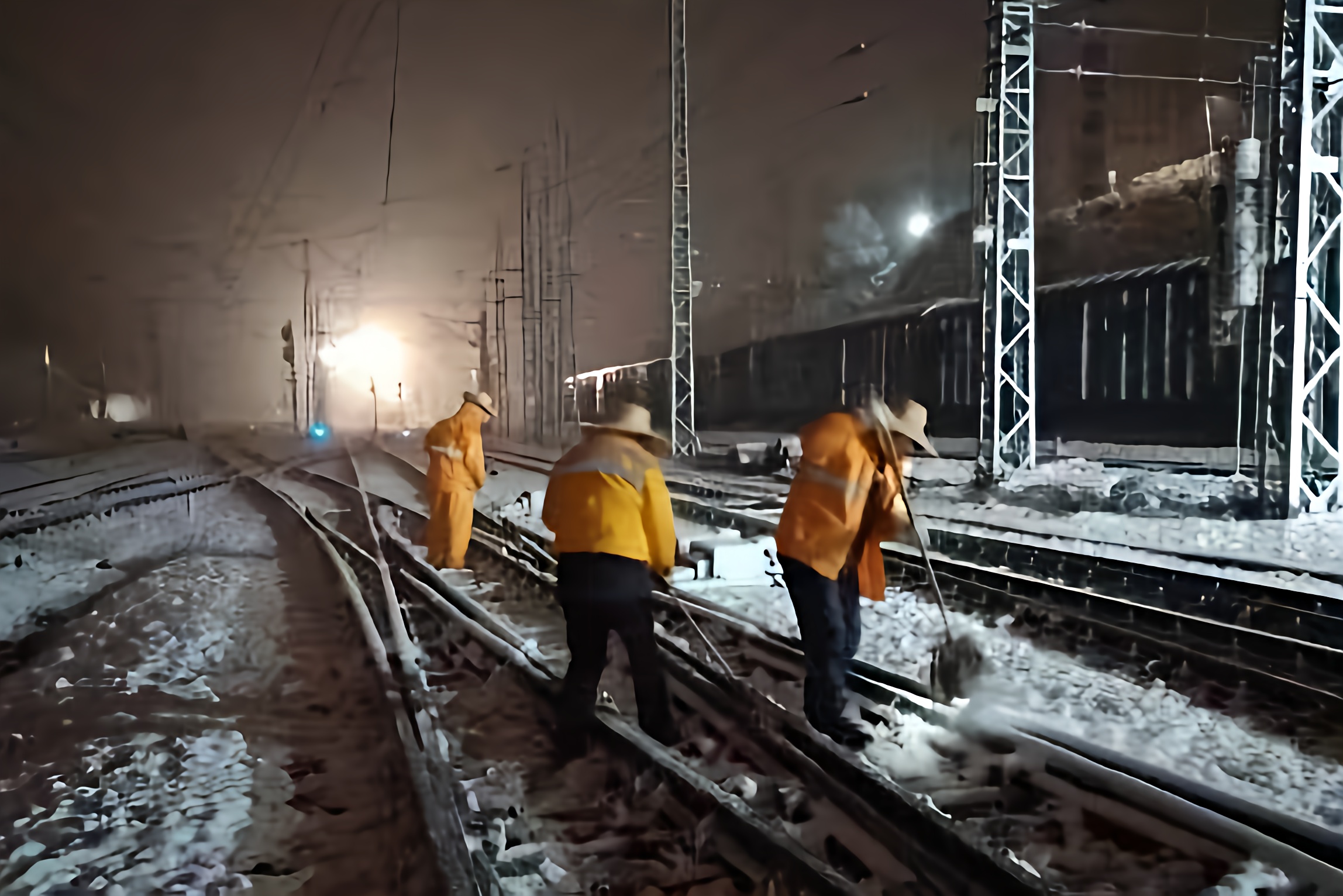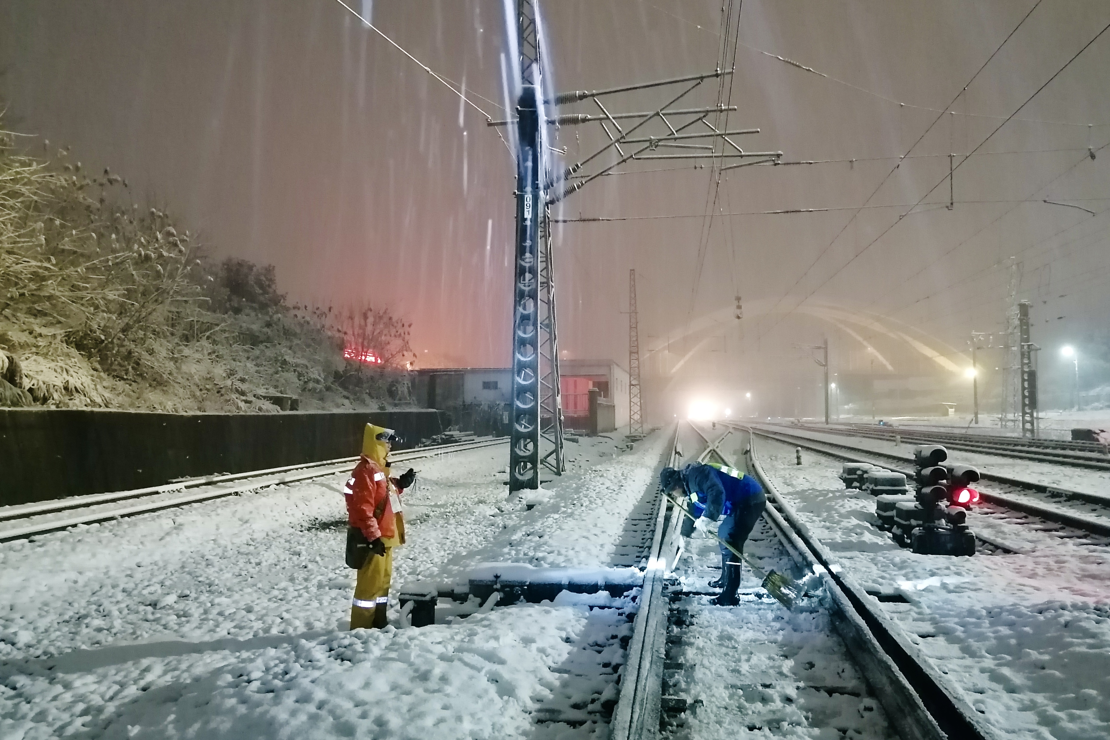 该段长沙南高铁信号车间、长沙南高铁通信车间近40余名干部职工驻守长沙南站站场,24小时做好应急处置准备;长沙信号车间党员、主任邹青,电务中修车间党员、主任龚栋,娄底信号车间党员、副主任李艳飞带领干部职工于22日凌晨1时上道对管内长沙站、长沙东站、娄底站等进行扫雪除冰;该段长沙西高铁信号车间副主任李东、高铁信号科工程师万占高,以及常德高铁信号工区王周礼冒着雨雪在常德站高速场带领职工于凌晨4时30分上道进行扫雪除冰数小时,为高铁安全畅通提供了坚强保障。