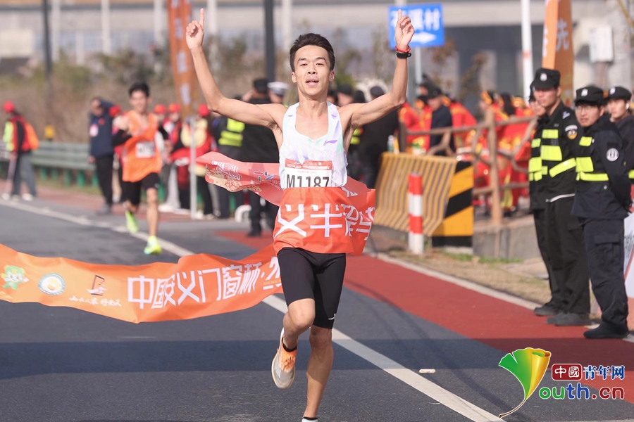 半程马拉松男子组冠军冲线。安义县委宣传部供图