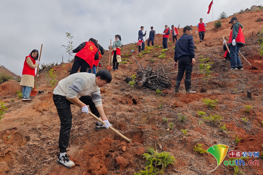 团员青年挥锹铲土植树添绿。共青团上犹县委供图