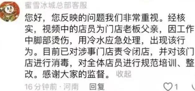 蜜雪冰城回应媒体称,视频中的涉事人员为门店老板的父亲,也是店里的员工,因工作中脚部被烫伤,用冷水应急处理,才出现该行为。蜜雪冰城已对涉事门店责令闭店,并对门店进行消毒,对店员进行规范培训及整改。