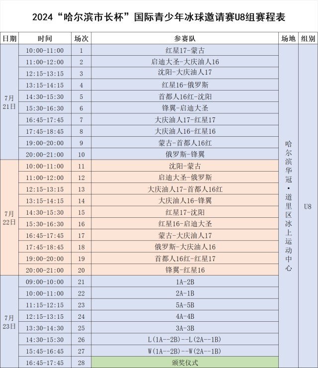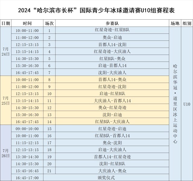 记者16日从哈尔滨市体育局获悉,2024“哈尔滨市长杯”国际青少年冰球邀请赛将于7月18日至26日在哈尔滨华冠·道里区冰上运动中心举办。