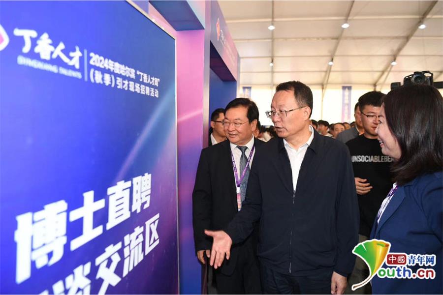 黑龙江省委常委、哈尔滨市委书记于洪涛到招聘展区巡展指导。哈尔滨市委宣传部供图