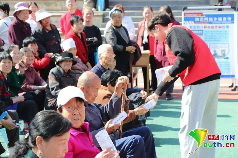 志愿者向老年人发放防范网络诈骗宣传手册。团咸阳市委供图