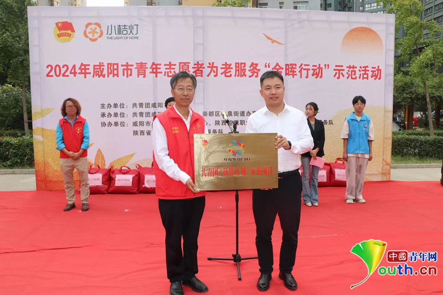 活动现场,团咸阳市委书记、市青联主席高俊为咸阳市小桔灯公益服务中心颁授共青团“伙伴计划”项目示范牌,秦都区委常委、组织部部长王高林在致辞中介绍了秦都区日间照料中心覆盖情况并勉励青年志愿者要为老年人提供更优质的服务,共同为 10 名困难老人送上慰问品,让受助老人感受到了党的关怀。