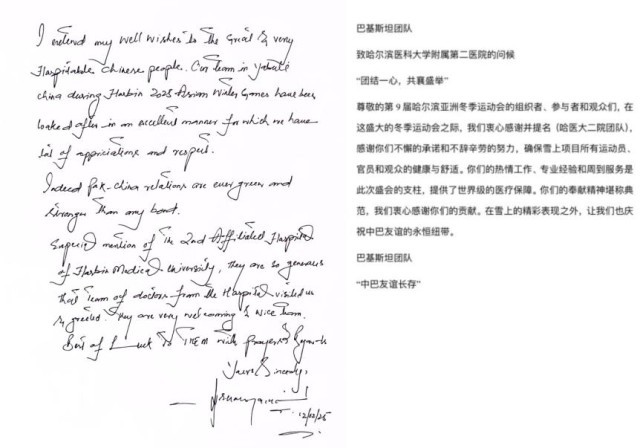 第九届亚冬会亚布力赛区副指挥长、哈医大二院院长徐万海教授表示,这枚勋章和感谢信,不仅是对我们工作的认可,更是一种激励。我们定会不负信任,继续以高度的责任感和专业精神,做好医疗保障工作,为各国运动员、官员提供最优质的医疗服务。愿中巴友谊长存,历久弥坚。