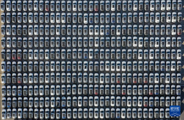 2月25日,等待装船的车辆停靠在天津港环球滚装码头(无人机照片)。