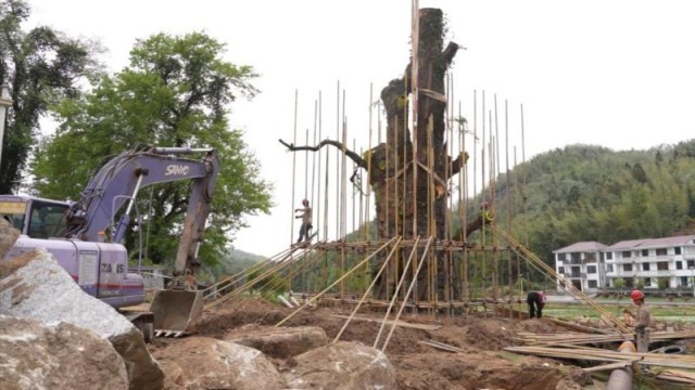 这棵古银杏树位于南昌市太平镇太平村。16日下午,记者抵达现场看到,为了便于扶正,多余枝干已被锯掉,仅留树根及根部以上 12米树干。在吊机的协助下,抢救人员将其重新栽种回原地块,并在四周搭建脚手架固定。一旁还堆放着巨石,似乎在诉说着古树曾经的坚韧。