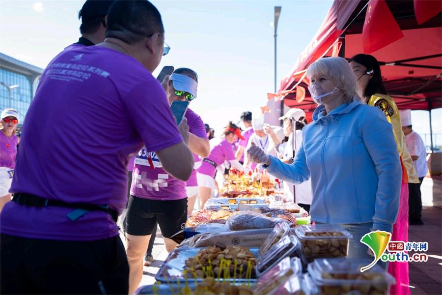 赛道旁的补给站,空气中都弥漫着香甜。15个“舌尖驿站”成了最接地气的“文化交流窗口”,冰镇东北冻梨清甜解腻,铁锅炖大鹅、烤全羊散发着浓浓的东北烟火气;俄罗斯格瓦斯醇厚爽口,俄式大串、盘肠带来异域风味。一场“流水席”般的补给,让各路跑友在“全饱”与“吃撑”的调侃里,感受最鲜活的“跨国对话”。