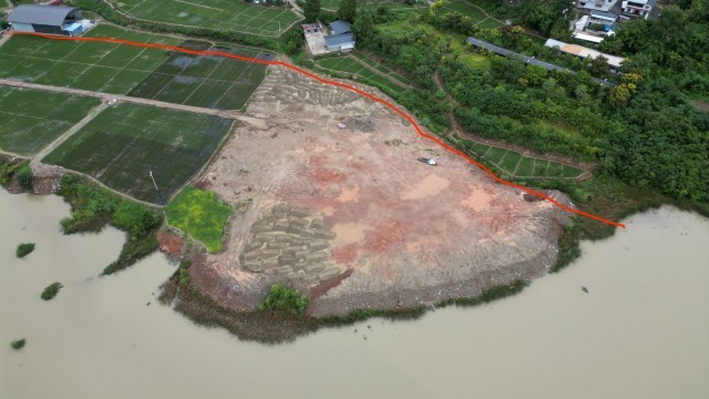 村民介绍,红线外均为填埋的河滩地。本文图片来源 澎湃新闻记者 胥辉 摄
