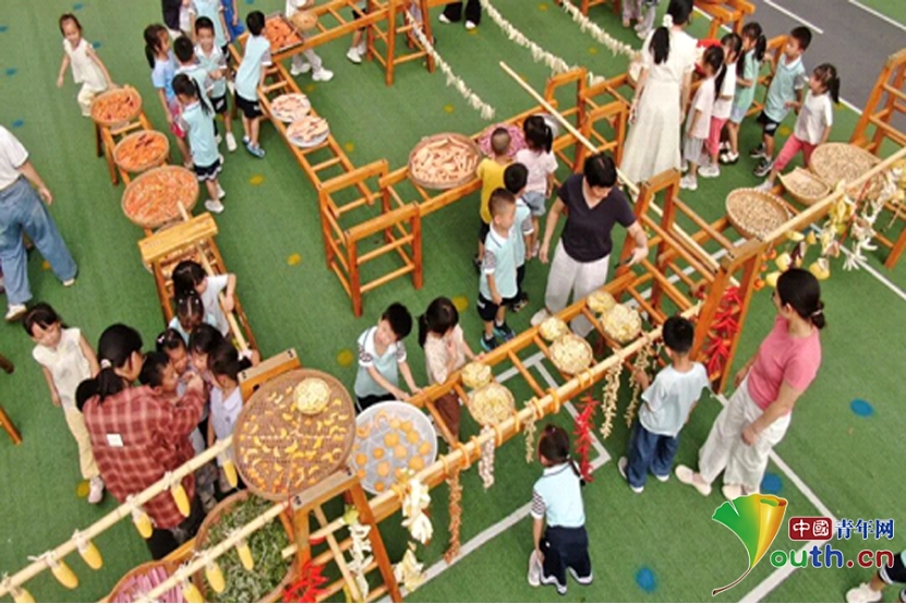 西江中心幼儿园的“丰收集市”同样热闹非凡。孩子们化身“小摊主”模拟售卖农产品,参与运粮竞赛,亲手制作豆浆、南瓜饼等美食,在充满童趣的游戏中体验收获的乐趣。幼儿刘子玲兴奋地说:“卖花生、磨豆浆、做游戏,和小朋友分享美食,很开心!”该园副园长王春英表示,希望通过沉浸式游玩,让孩子们学会尊重自然、热爱劳动,懂得珍惜每粒粮食。