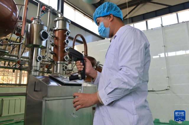 10月21日,在海城市马风镇一家南果梨酒厂内,工人在蒸馏间检测样品酒精含量。