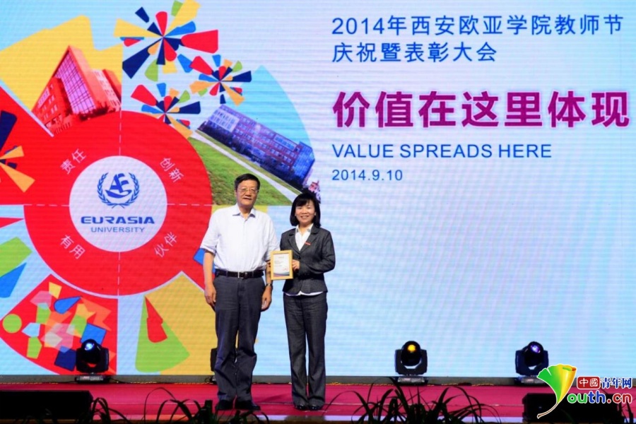 2014年教师节庆祝表彰大会,宋粉鲜(右)在领奖台上。西安欧亚学院供图