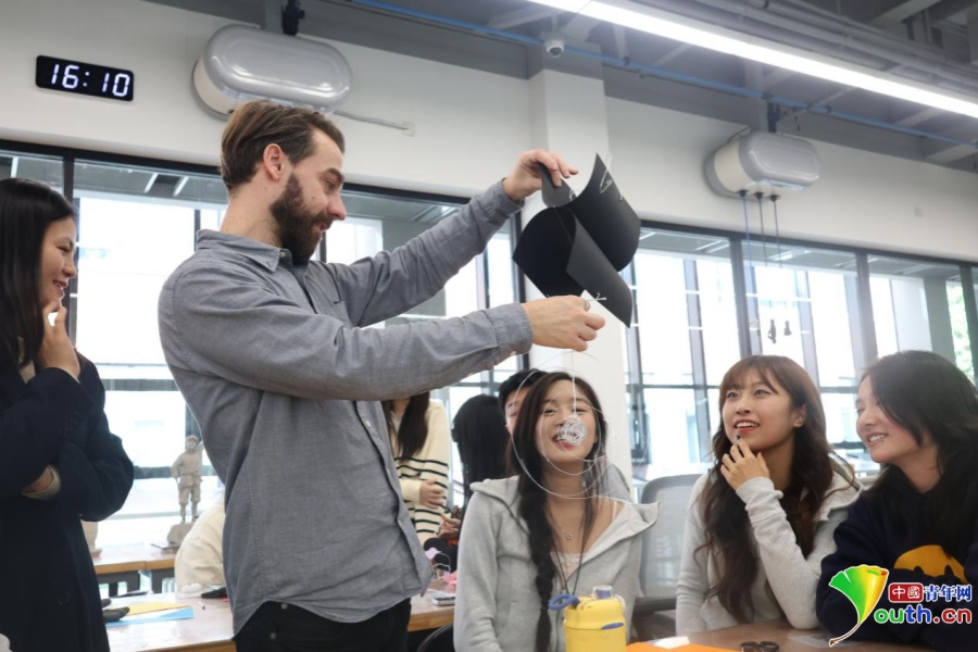 外教老师和同学们在课堂上进行实践互动。西安欧亚学院供图