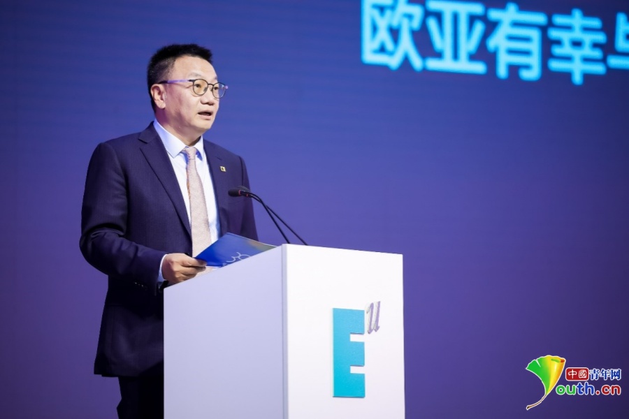 西安欧亚学院创办人、董事长胡建波在西安欧亚学院30周年校庆主庆典致辞。西安欧亚学院供图
