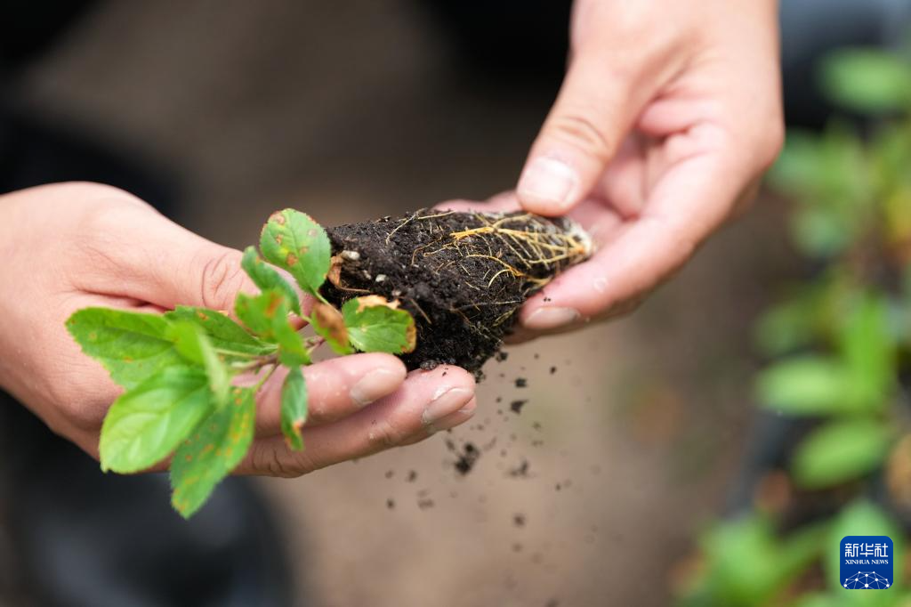 6月10日,在白水县兴华果蔬有限责任公司,技术人员查看组培脱毒苹果砧木苗的生长情况。