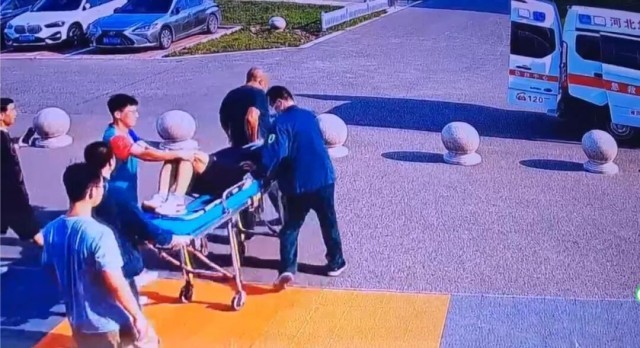 顾一哲(手扶患者双腿者)协助医护人员护送患者(视频截图)